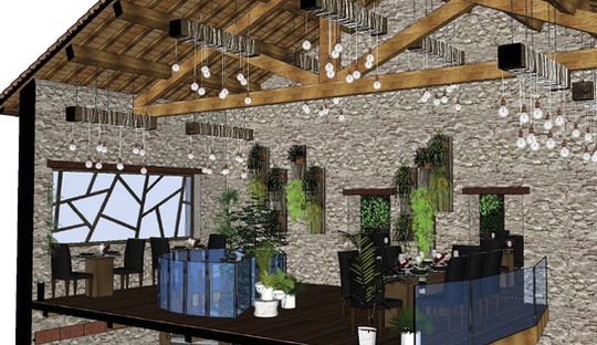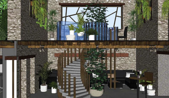 Pour ce faire de nombreux éléments végétaux et effets graphiques ont été incorporés au sein du bâtiment pour rappeler l’environnement extérieur, et de grandes ouvertures dans les murs de la grange permettent ainsi de se croire en extérieur, même à l’intérieur.